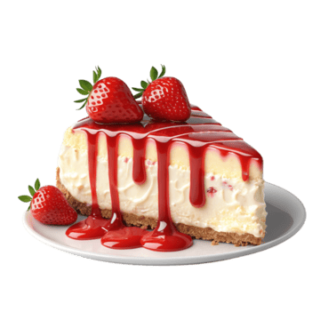 Tarta fría de queso crema sobre una base de galletas, cubierta con una generosa capa de mermelada o coulis de fresa y fresas frescas.