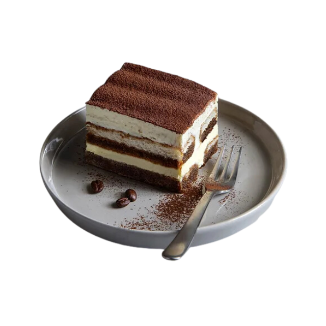 Postre italiano en capas, hecho con bizcochos de soletilla empapados en café, crema de mascarpone y espolvoreado con cacao en polvo.